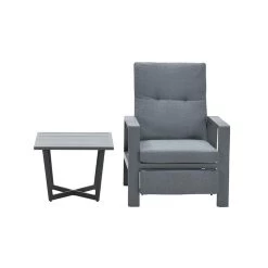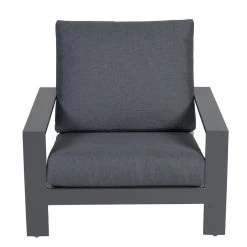 De Coba loungeset is eenvoudig uit te breiden met een Coba loungestoel. Ook deze stoel is volledig gemaakt van donker grijs aluminium. De loungestoel heeft een schuine zitting wat zorgt voor extra zitcomfort, een extra hoge rugleuning en een mooi strak design. Deze Coba lounge fauteuil is gemaakt van onderhoudsvrij en weerbestendig aluminium met een stevige donker grijze poedercoating. Deze extreem stevige coating zorgt ervoor dat het frame kras- en stootvast is. Sieraden zullen de loungestoel niet beschadigen. De meegeleverde dikke kussens zijn gemaakt van hoogwaardig kwaliteit polyester. De mint grey kleurige kussens zijn voorzien van een rits waardoor de hoezen gemakkelijk met de hand kunnen worden gewassen. De kussens zijn niet waterbestendig en kunnen na gebruik worden opgeborgen in de schuur of kussenbox. Wel zijn de kussens voorzien van een waterafstotende coating. Dit is vooral erg praktisch als er bijvoorbeeld op het kussen wordt gemorst met drinken. Je veegt het vocht er namelijk gemakkelijk weer af. De Coba lounge stoel wordt volledig gemonteerd geleverd. De stoel is voorzien van pootdopjes welke ook verstelbaar zijn. Zo kan je de lounge fauteuil gemakkelijk waterpas zetten. Daarnaast zorgt het voor een nette afwerking van de lounge stoel. De Coba lounge fauteuil past perfect bij de Coba loungeset. Met de lounge stoel creëer je gemakkelijk een extra zitplek bij de loungeset. De Coba loungeset is daarnaast uit te breiden met een prachtige Coba midden element. Plaats het midden element tussen een lounge bank en het hoek element om de loungebank langer te maken. De Coba serie van Garden Impressions is leverbaar in het wit of donker grijs. De loungestoel heeft een afmeting van 90 x 95 x 78 cm.